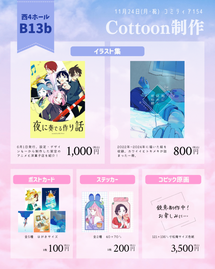 11月24日(月・祝)開催のコミティア154に出展いたします!既刊イラスト本2冊とグッズ、コピック原画を頒布予定です。前回6月のコミティア参加時に出したイラスト本『夜に奏でる作り話』は在庫限りの頒布となっております。この機会にぜひお買い求めください。